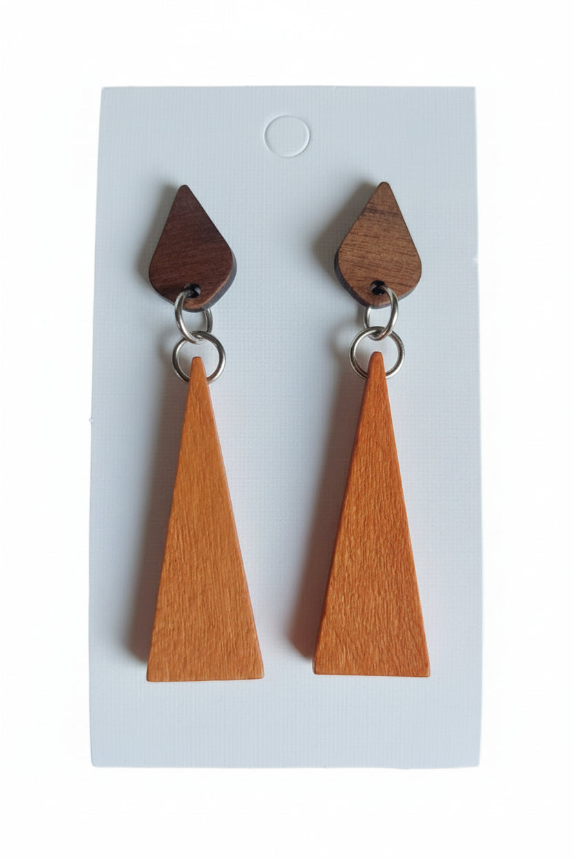 Metsämaahisen Metsä -korvakorut huokuvat luonnon rauhaa ja yksinkertaista kauneutta. Kaksi erilaista puun sävyä muodostavat harmonisen kokonaisuuden, jossa lämmin, vaaleampi puukolmio ja tummempi pisaran muotoinen yläosa luovat tasapainoisen ja näyttävän muodon.