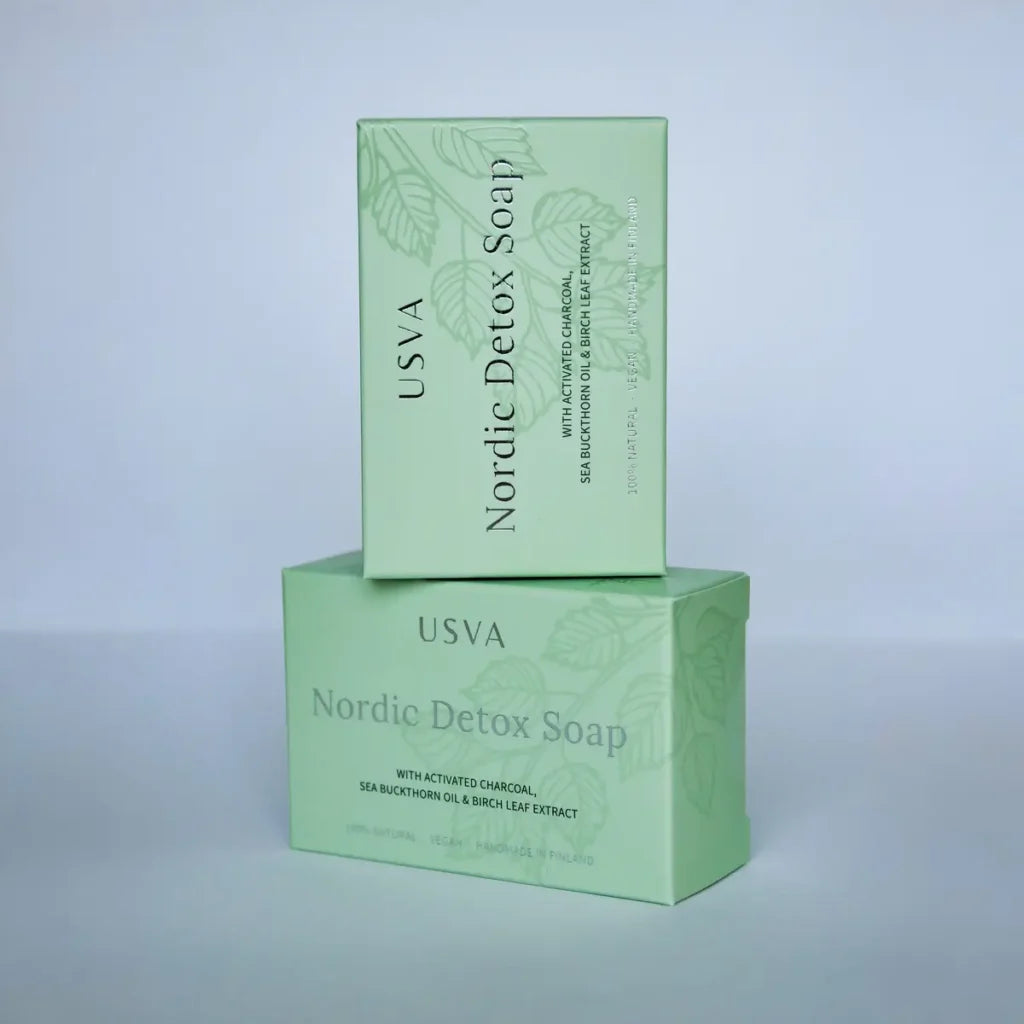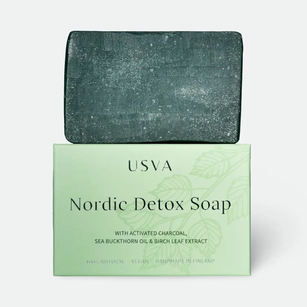 Hellävarainen Nordic Detox palasaippua sopii kaikille ihotyypeille, erityisesti epäpuhtaalle ja rasvoittuvalle iholle. Saippua pesee kädet, vartalon ja kasvot huolellisesti puhtaaksi ihoa kuivattamatta, ja hyvin vaahtoava koostumus tekee pesuhetkestä miellyttävän. Suomalaisilla raaka-aineilla rikastettu saippua on suunniteltu päivittäiseen käyttöön ja tukemaan ihoa pohjoisen kuivan ja vaihtelevan ilmaston rasituksessa.